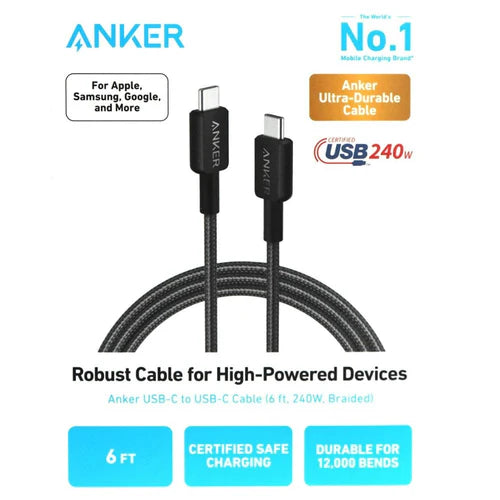 The Anker USB Type C – USB Type C cable provides a reliable and powerful connection for various devices. With a length of 1.8 meters, it allows for flexible use, whether for charging or data transfers. The cable supports a power output of up to 240 watts, making it ideal for fast charging compatible devices. Its braided construction ensures additional durability and flexibility, making the cable less prone to damage. Thanks to USB 3.1 support, data transfer rates of up to 10 Gbit/s can be achieved, making it an excellent choice for modern devices. The straight connectors at both ends ensure easy handling and compatibility with a wide range of USB-C devices. This cable is a practical solution for anyone who values quality and performance.