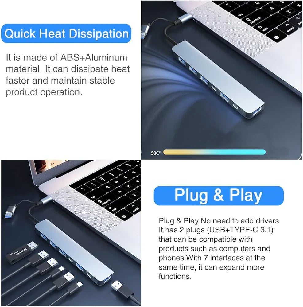 USB C Hub for Laptop,USB 3.0 Hub,7 in 1 USB-C Hub,Two Kinds of Plugs DC Port USB Splitter for PC,USB Extender USB Hub for PC Laptop,MacBook iMac Air Mac Mini/Pro, Notebook PS4,Aluminum (7 Pout)
