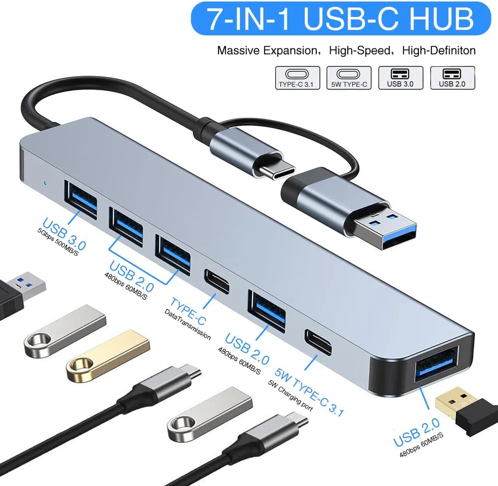 【7 in 1 USB Hubs】: USB 3.0 X1 + USB 2.0 X4+USB-C X 2. USB 3.0 SuperSpeed data transfer up to 5 Gbps, 10x faster than USB 2.0. Transfer files, HD movies and songs to your USB devices in seconds. ngs to your USB devices in seconds.5W charging interface and data transmission interface to meet the diverse needs of users