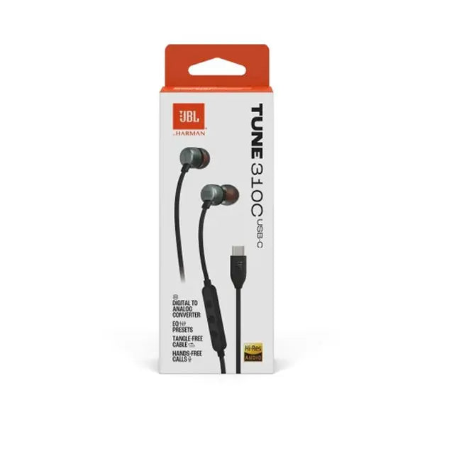 Introducing JBL Tune 310C USB-C in-ear headphones. They’re lightweight,comfortable and compact. A pair of 9mm dynamic drivers punch out powerful JBL Pure Bass Sound, while the High-Resolution Audio support ensures great sound quality. A USB-C connection makes them compatible with a large variety of devices like PCs, mobiles, and gaming devices. In addition, the three-button remote on a tangle-free flat cable lets you control music playback and volume adjustment, EQ presets, as well as answering calls on the fly with a built-in microphone. All this makes the JBL Tune 310C USB-C your everyday companion, at work, at home, and on the road.