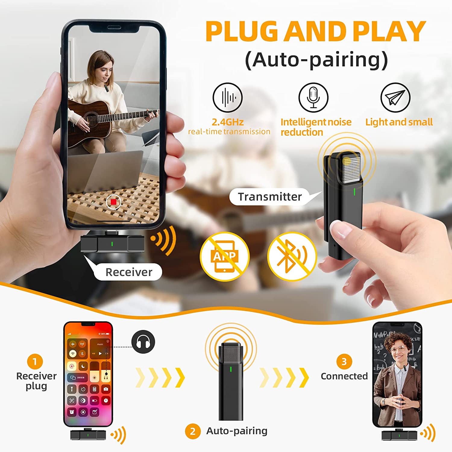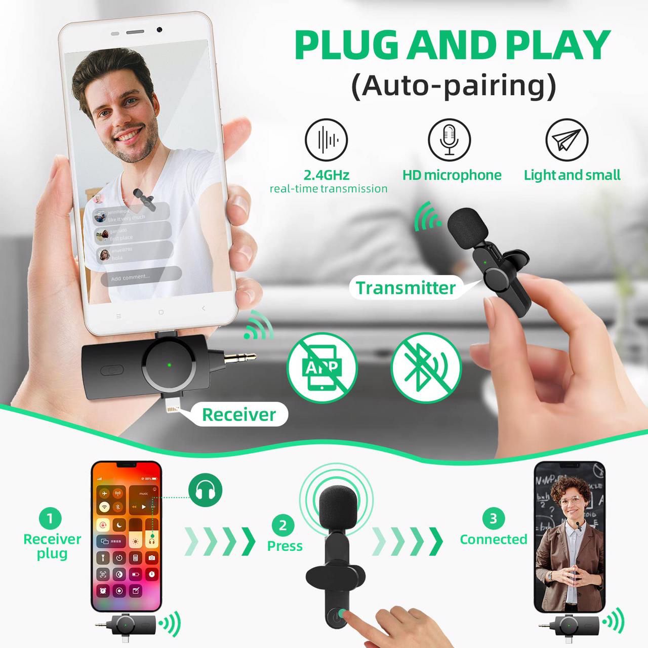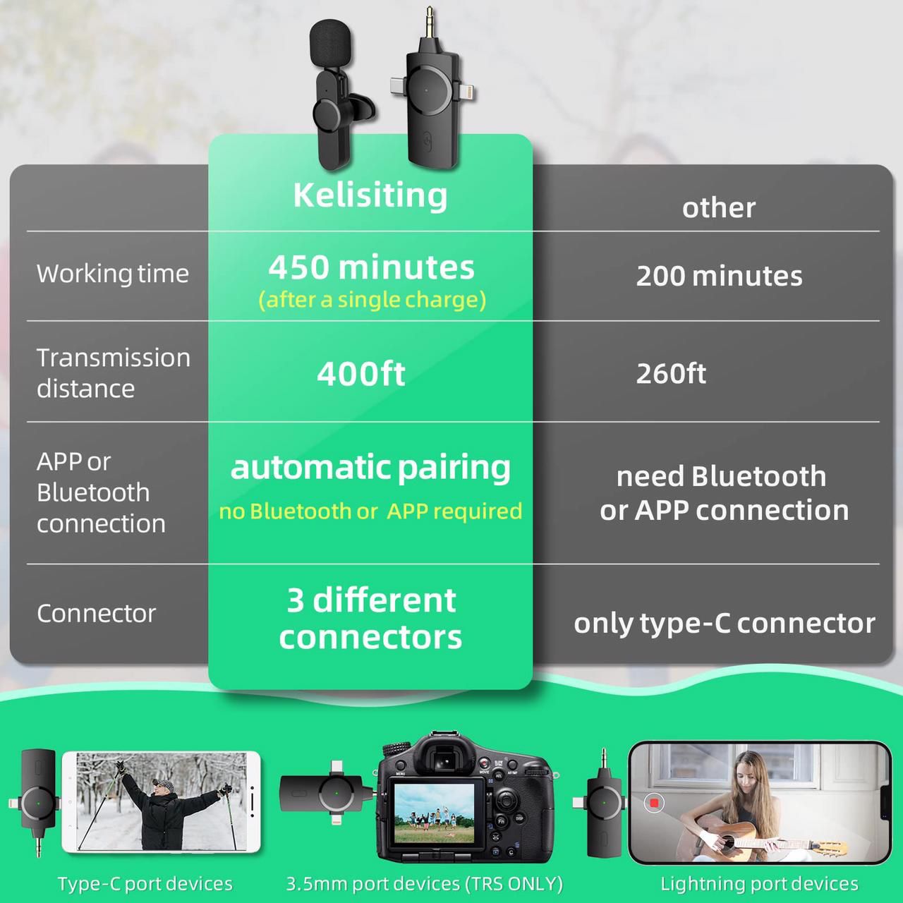 - 【Fast and Convenient】Kelisiting wireless lavalier microphone is Plug & Play,Auto-Pairing,no need to download APP or turn on Bluetooth;just plug the receiver into your cell phone,the receiver and microphones will auto-paired successfully