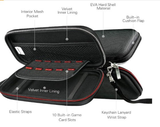 IN-BUILT STORAGE & ORGANISATION: A dedicated compartment is specially designed to securely hold your console in place, storage pockets offer additional space for smaller accessories such as headphones, cables etc, and finally the padded screen protection panel can also store up to 10 games cartridges so you always have your favourites within easy reach (though it is advisable not to store too many of your games in one place to spread the risk of losing them all)