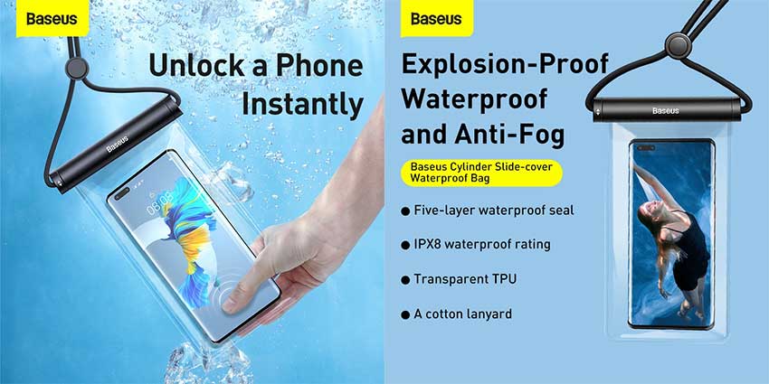 - Five-layer waterproof seal: Dual waterproof sealing strip, a rolled-up sealing strip, a slide-over cylinder, and a swivel lock form a five-layer waterproof seal to protect phones.