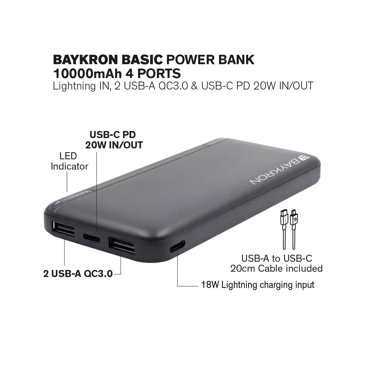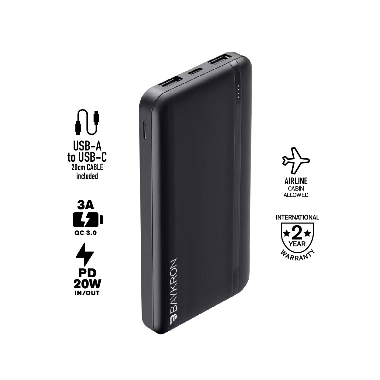 Baykron BASIC Power Bank 10000 mAh, USB-C PD 20W and USB-A QC 3.0 - Black