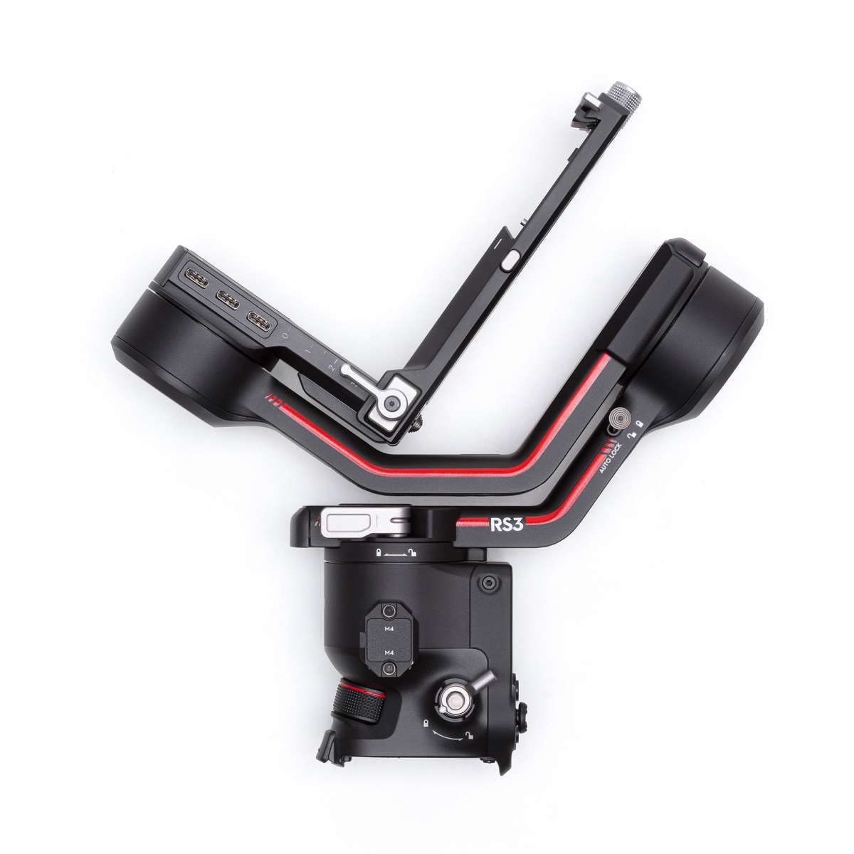 Speed is key With the RS 3 you can get started right away. With the gimbal powered off, press and hold the power button and the three axes will automatically unlock and extend, allowing you to start recording in seconds. Press the power button once and the axes will automatically lock and go into sleep mode, making equipment transport and storage much more efficient. Press and hold the power button and the gimbal will fold and lock automatically.