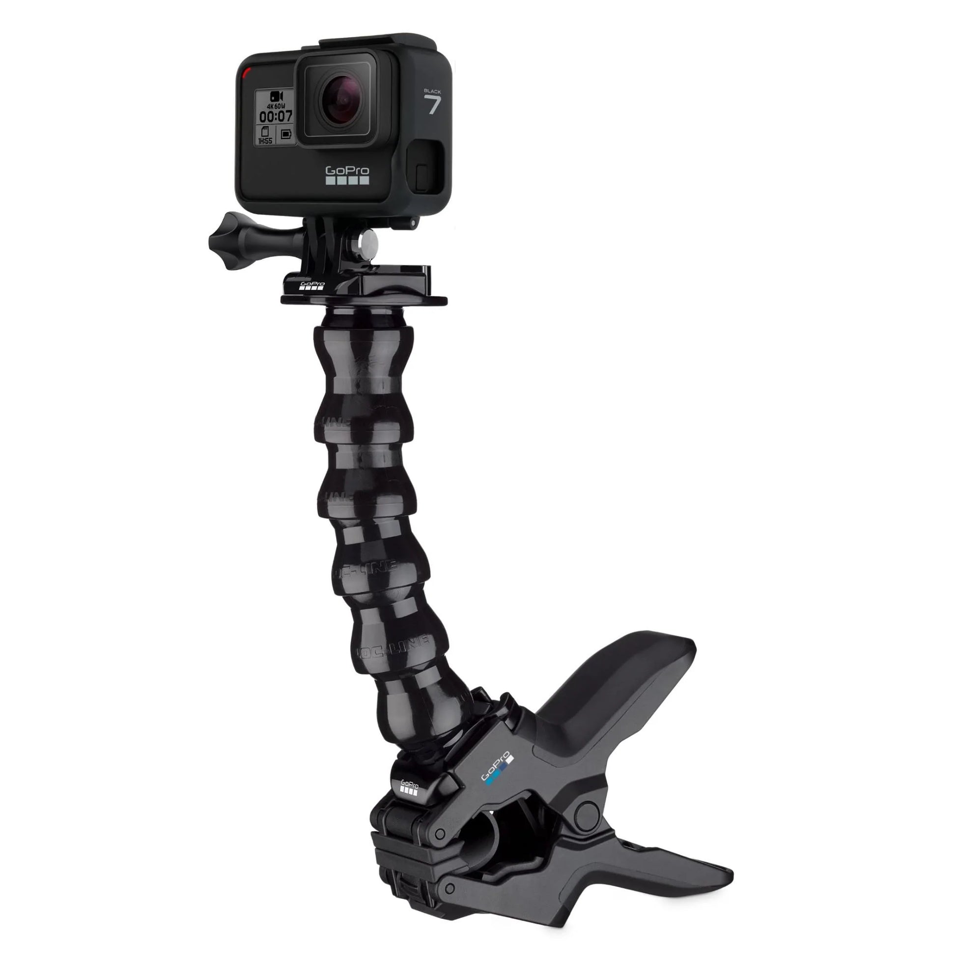 Clamp your GoPro to objects ranging in size from 0.25 to 2in (0.6 to 5cm) in diameter. Attach your camera directly to the clamp for low-profile mounting, or use the optional neck to achieve a wider range of camera-angle adjustability. Jaws securely grips irregular shapes and super slim objects thanks to its innovative design.