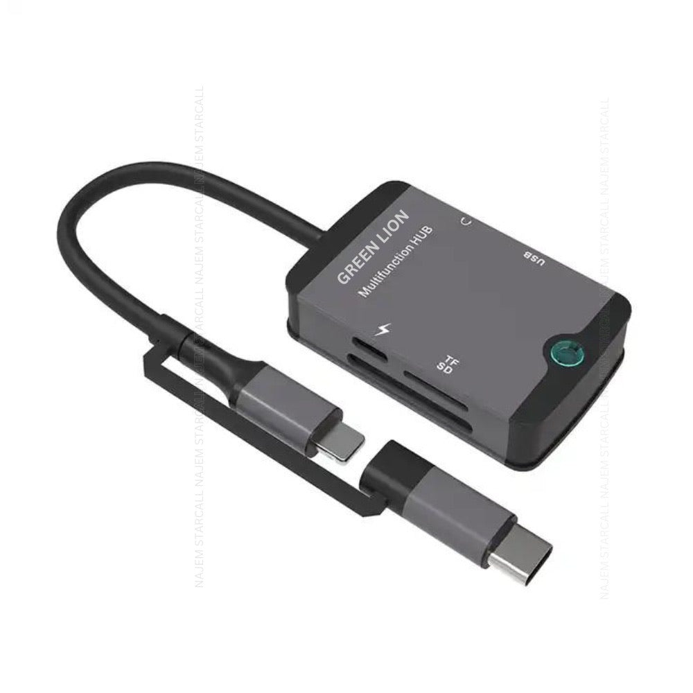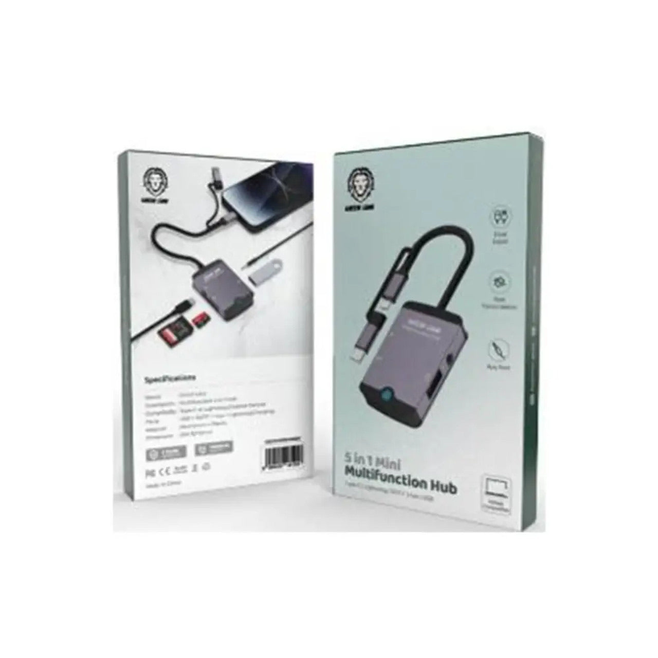 Experience connectivity at its best with the Green Lion 5-in-1 Multifunction Hub. This hub's Type-C, Lightning, SD/TF card slots, Aux, and USB ports are all thoughtfully integrated to meet a variety of purposes, ensuring that every device has a compatible match. Made from a combination of high-quality plastic and sturdy metal, it guarantees longevity without sacrificing style. With its elegant dimensions, it's a portable powerhouse that's ideal for connectivity while on the move. Enjoy fast data transfer that promises productivity on every task. Dual input gives you even more freedom when it comes to connecting options. The Green Lion Multifunction Hub is the perfect link to seamless connectivity, whether you're working, traveling, or just relaxing.