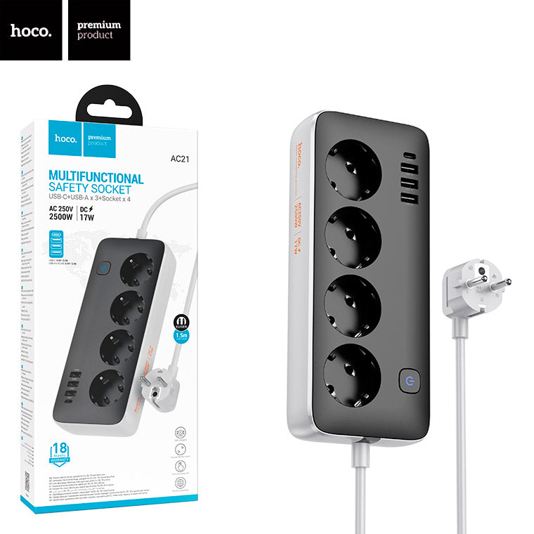 The HOCO AC27 Power Strip offers a reliable and efficient power solution for homes, offices, and travel needs. Combining high-power AC output with advanced USB fast-charging capabilities, it delivers both convenience and safety in a sleek, durable design. Its fireproof construction, extended cable, and compact form make it a practical choice for anyone seeking a modern charging hub.