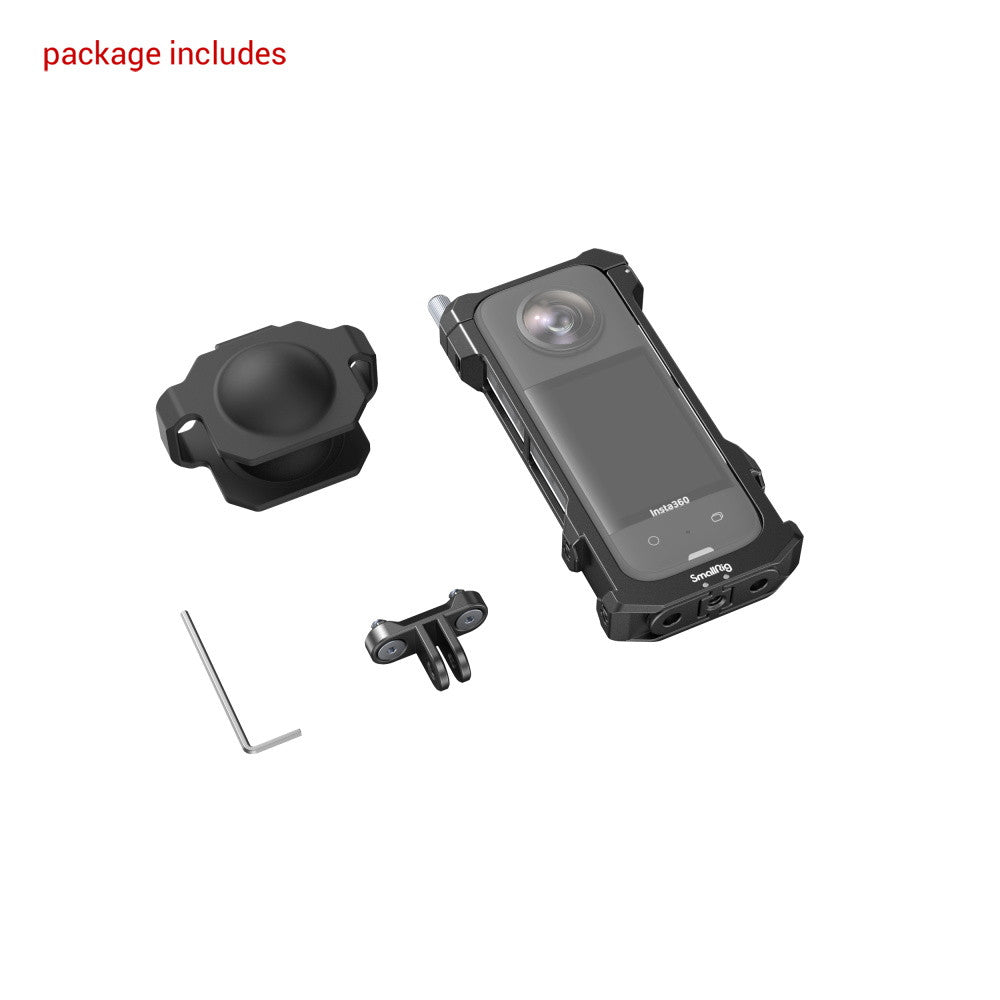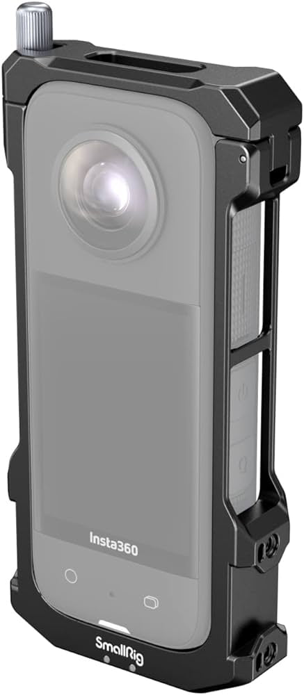 SmallRig Frame for Insta360 X3 4088B protects the camera and facilitates shooting by providing varied accessory mounting options. The formfitting frame features silicone cushions that prevent scratches and via a thumbscrew securely locks the camera which is put into the frame from its top. There are two cold shoes on both sides for accessories like a microphone and light. The included folding fingers are available to install on both sides for attaching selfie sticks, baseplates, etc. The built-in folding fingers at the bottom have a 1/4"-20 threaded hole for a tripod. Besides, a lens cap is included to prevent scratches.