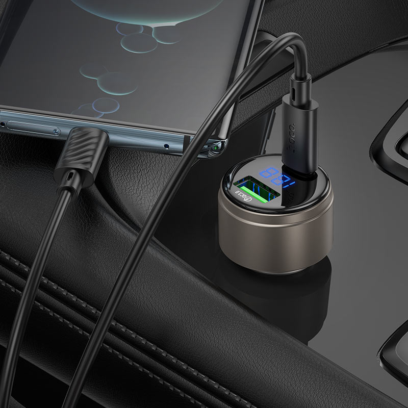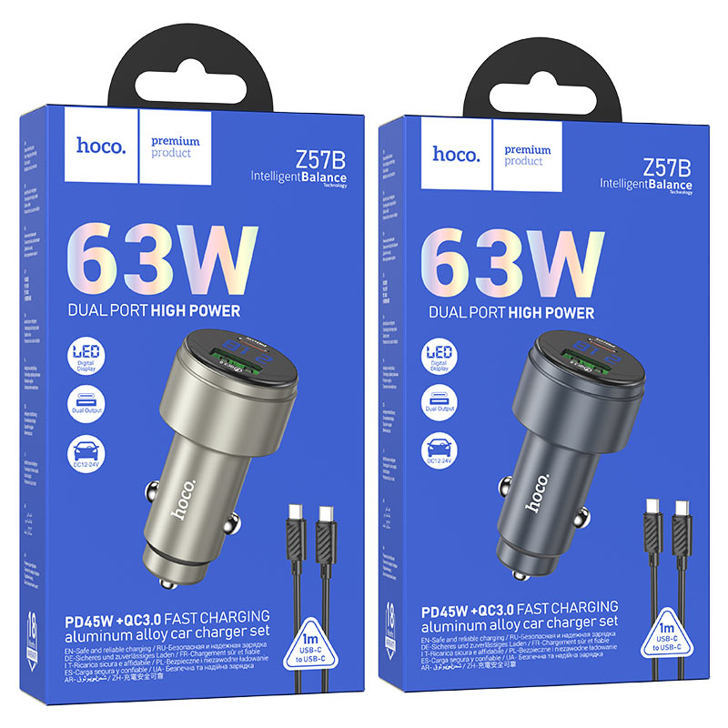 Car charger with Type-C and USB-A ports.Maximum output 63W.Supports fast charging protocols.LED digital display.Available set with cable.