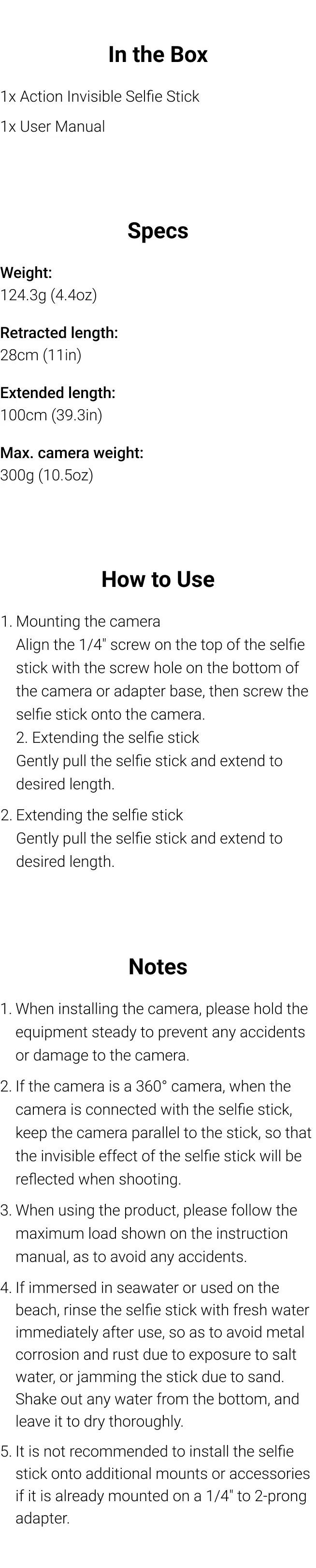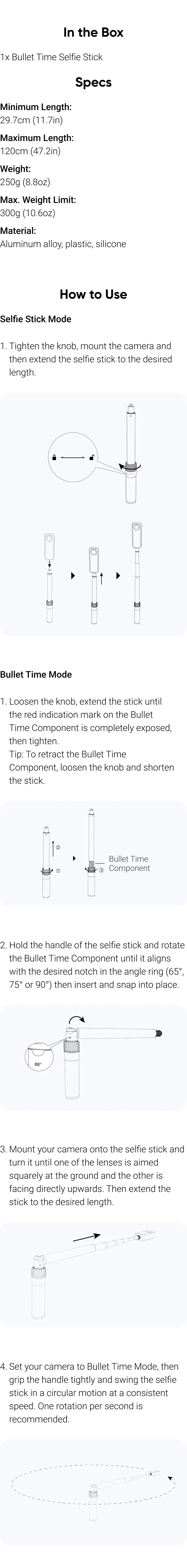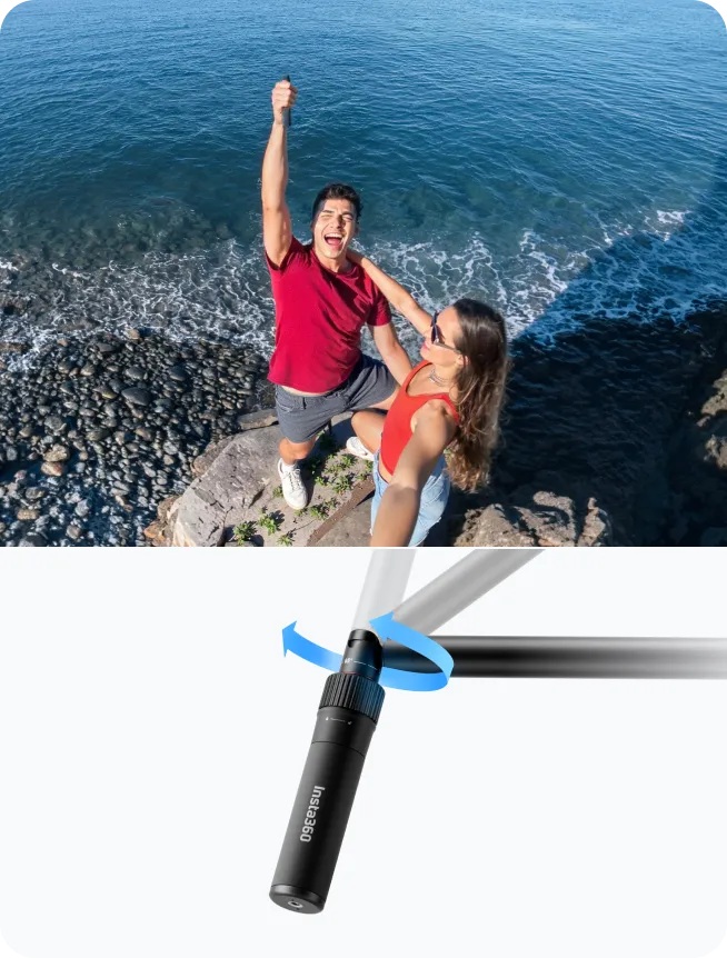 - For best stability, only extend the selfie stick to 2 sections (~70cm) with the ONE RS 1-Inch 360 Edition. When extending longer, please use discretion and assess the stability of the camera while shooting. Do not use long selfie sticks at high speeds or in action scenarios.