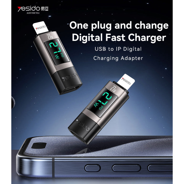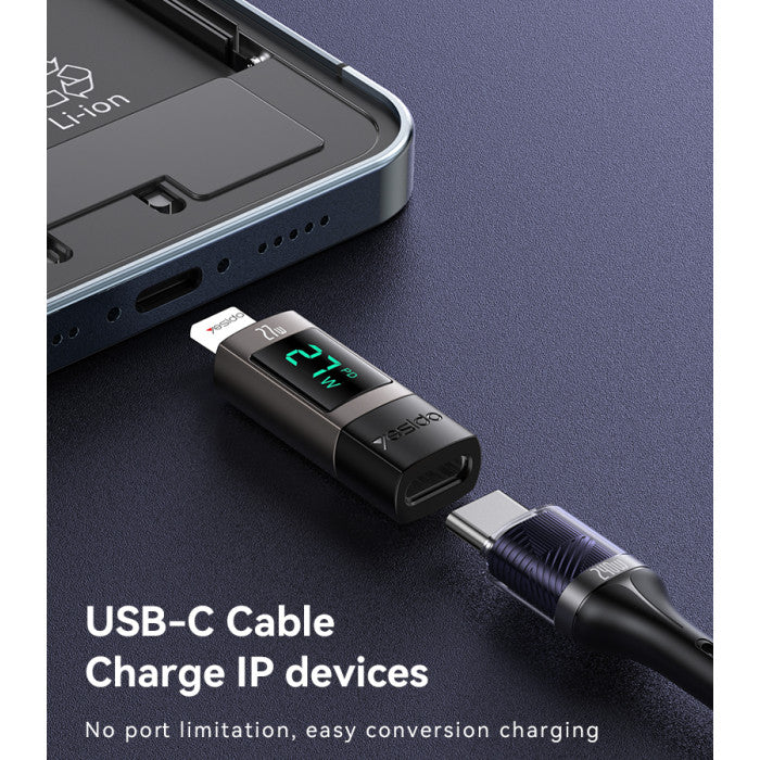 GS25 Yesido Aluminum Alloy Data Transmission 27W High Power Real-time Display USB-C to IP Digital Charging Adapter.